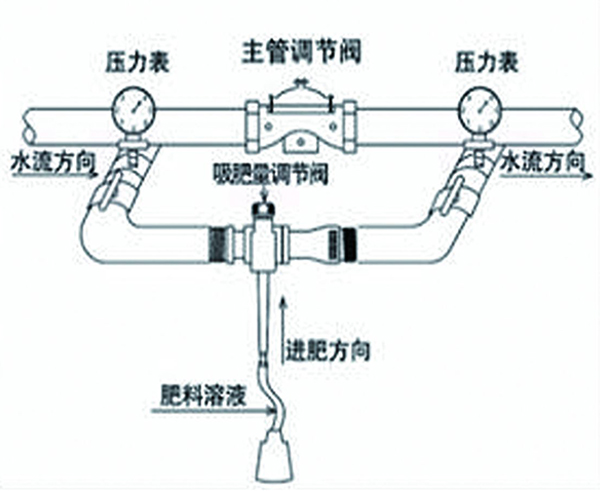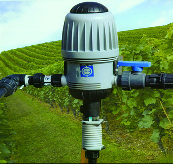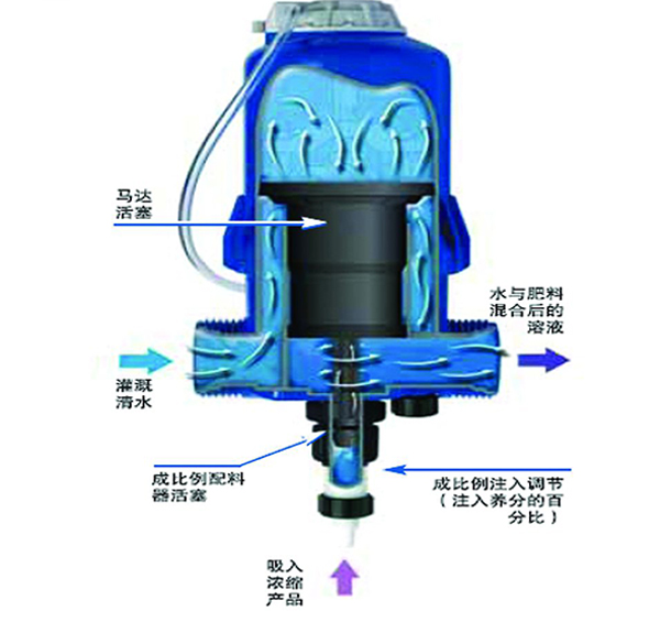 將比例注肥泵直接安裝在水管中,管路中水流的能動驅動泵工作,安設定比例定量將較高濃度的藥或肥液吸入,與主管中的水充分混合后被輸送到下游。且無論管路中的水壓及水流如何變化,吸入的藥劑量始終同進入比例加藥泵的體積成比例,確定混合液中的比例恒定。